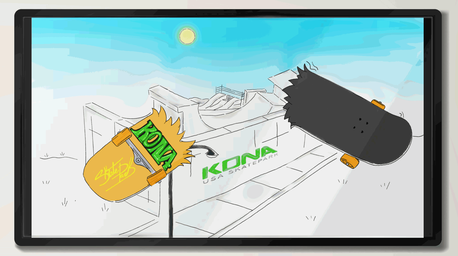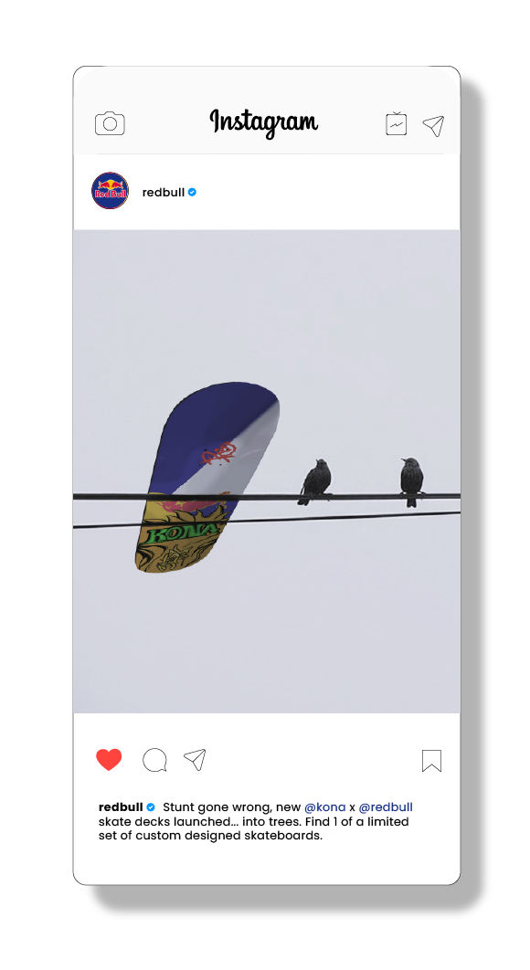 Give skaters an experience that celebrates the unique experience they already have with Kona skate park. By rooting the creative work in Kona's own visual history, incorporating generations of tags into the design language and activating Red Bulls brand energy through the lens of local skate culture. A lost skateboard becomes an organic moment of discovery for the collaboration of the two brands. A Red Bull can sprays paint, creating further moments incorporating the Red Bull brand into the scene. The paint never fades, and neither does the collaboration.